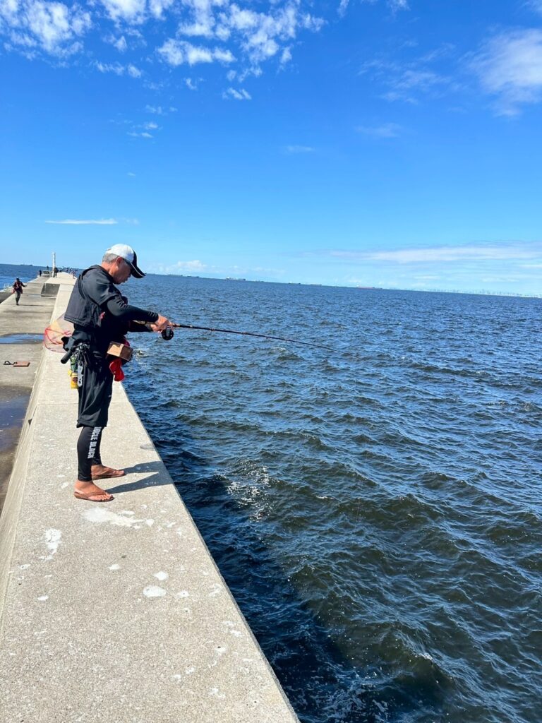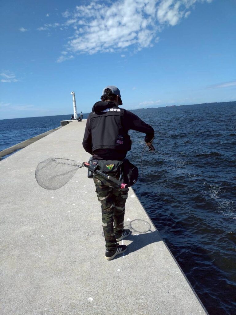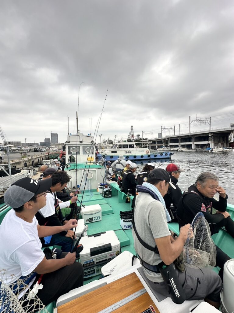 強風予報で出船が危ぶまれたが、前日夜に出船確定が出た時にはほっと胸をなでおろした。 当日は、早朝から守山丸が出船する千葉県寒川港に当会員15名、ゲスト参加者6名が集まった。 しかしながら、南風が強く沖合は十数メーターの風が吹いている状況。 北風に変わり風が穏やかになるタイミングまで遅らせてからの出船となった。 堤防に向かうまでの海の色は思いのほか良く、全員が臨戦態勢で青灯に渡堤した。
